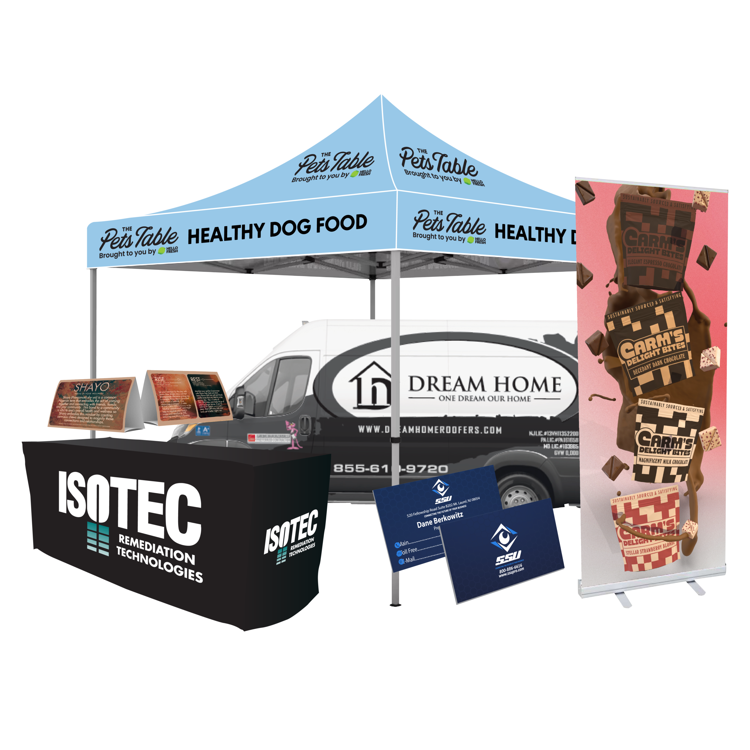 Retractable banners, backdrops, foamcore displays, table throws, and branded booth kits.